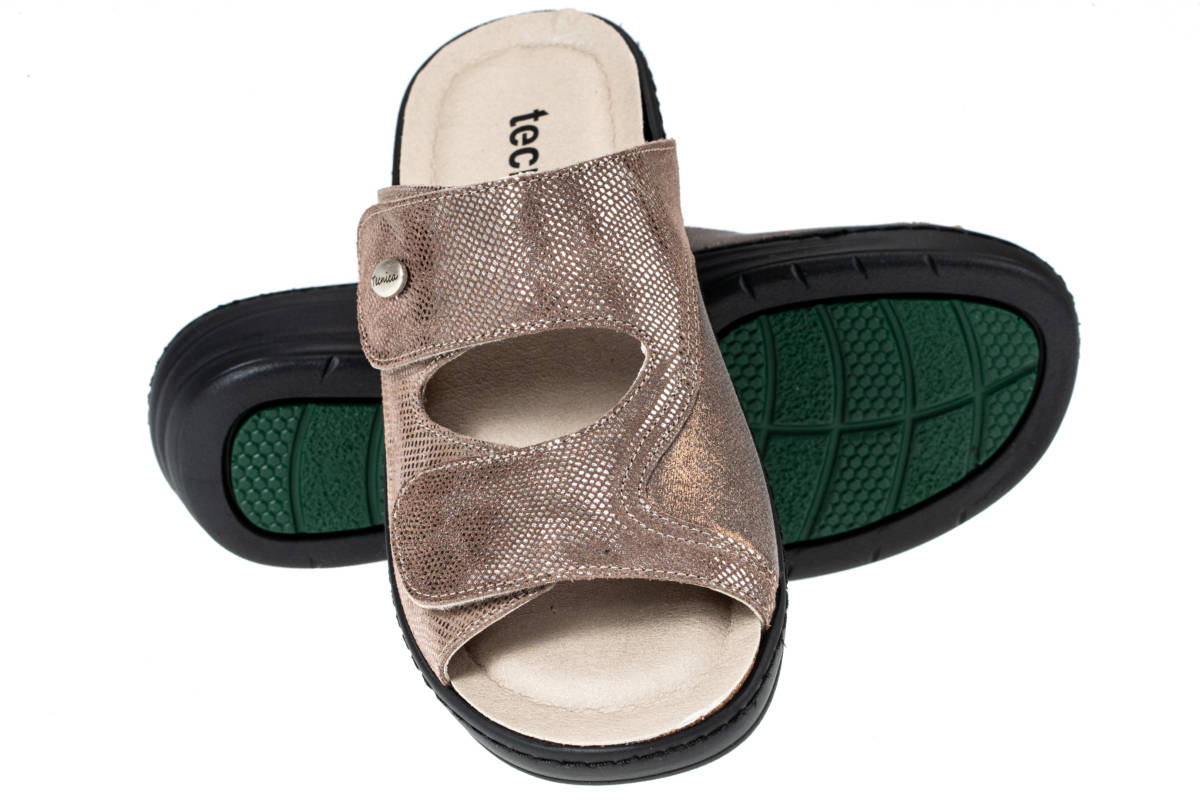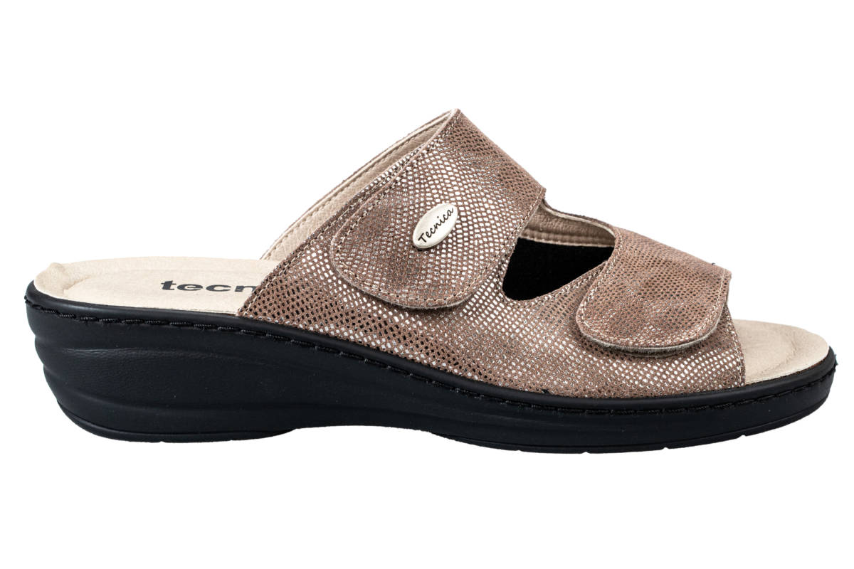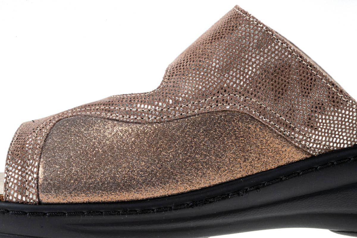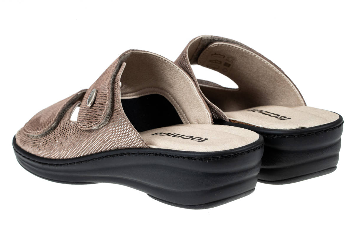 La tomaia automodellante e senza cuciture interne nelle zone di sfregamento consente di adattarsi al piede contenendo comodamente le deformità inoltre è predisposta per l’inserimento di un plantare personalizzato, la chiusura a velcro consente di aprire totalmente la tomaia e regolare così il volume interno in base alla necessità.